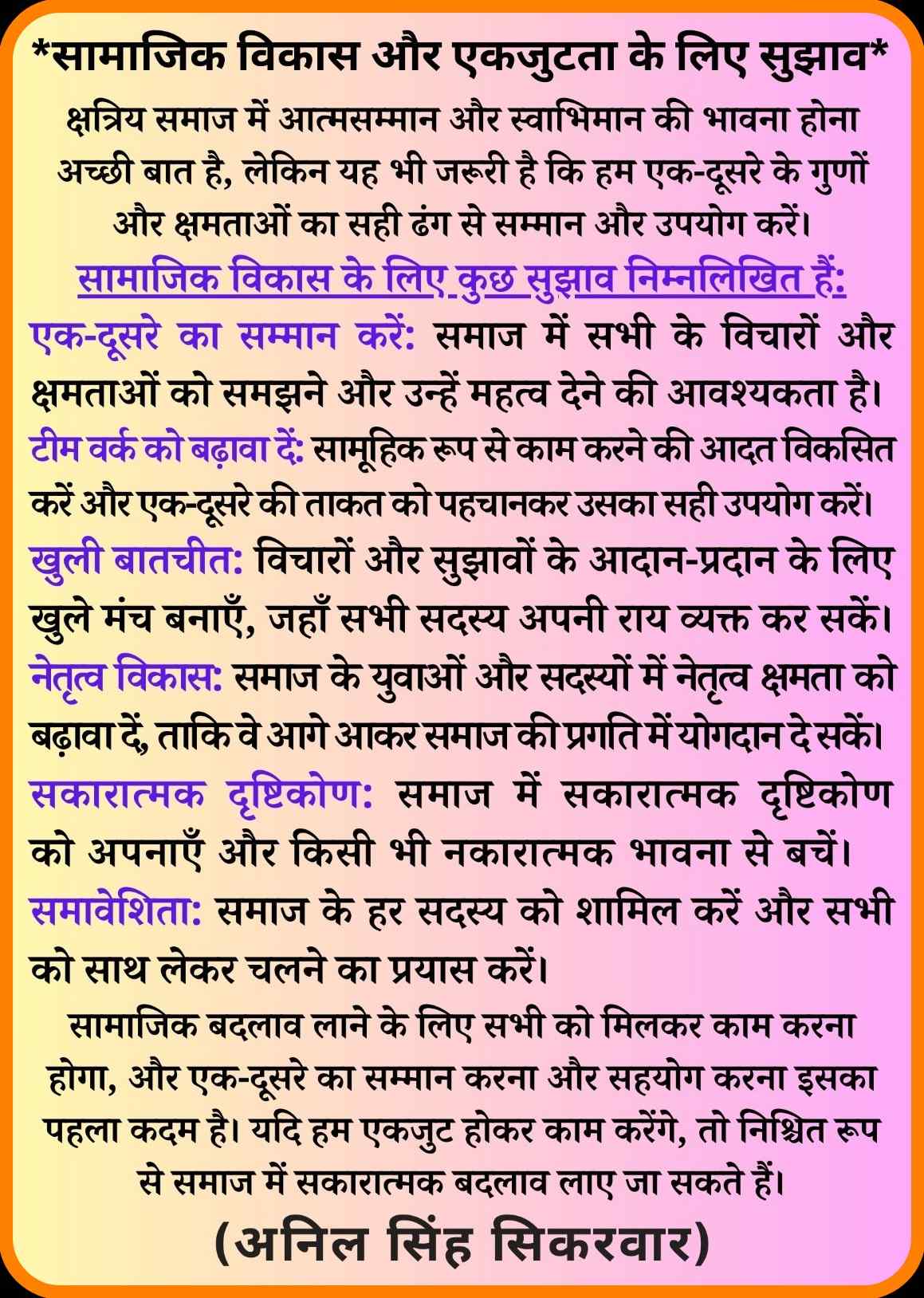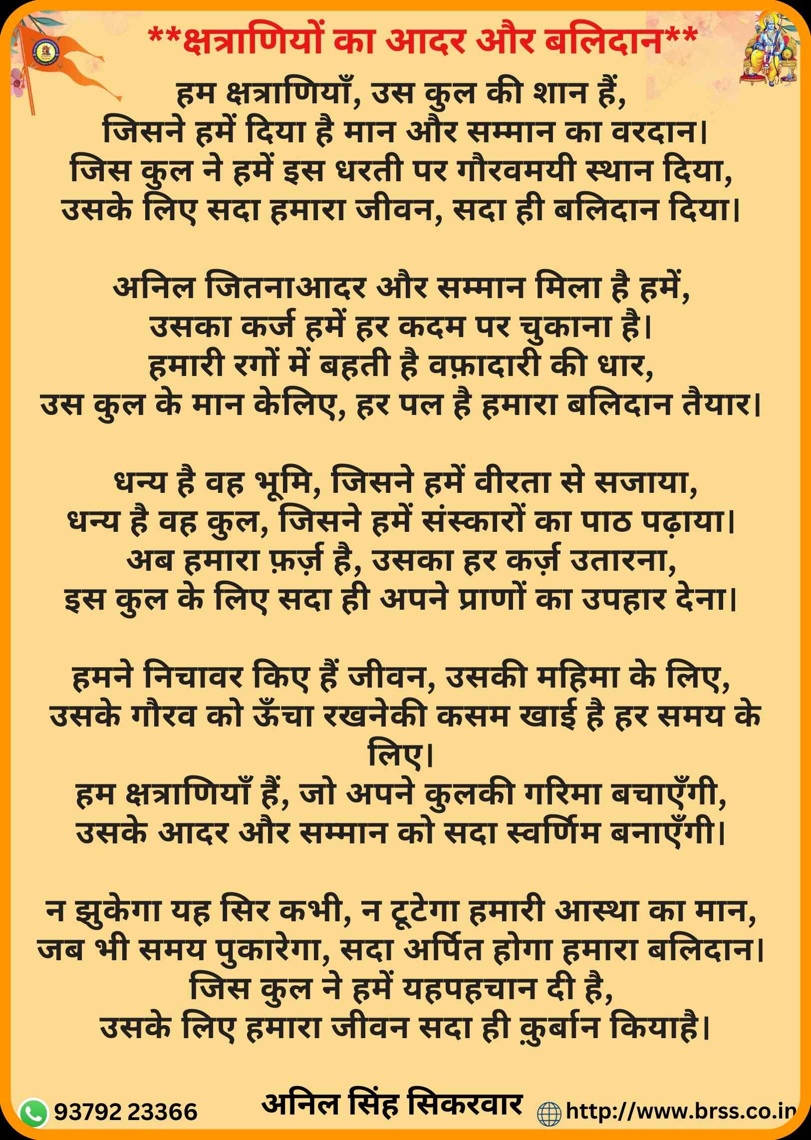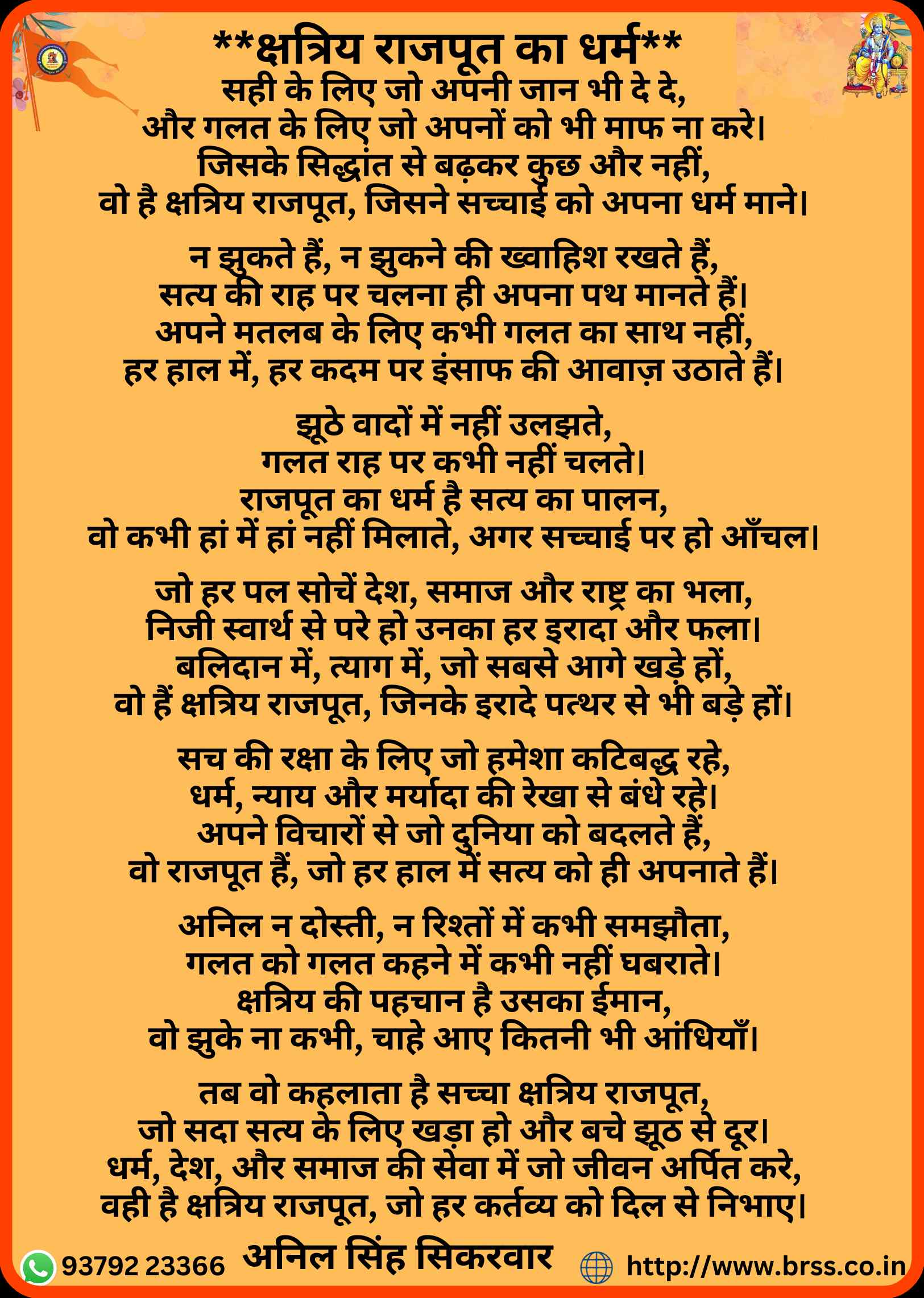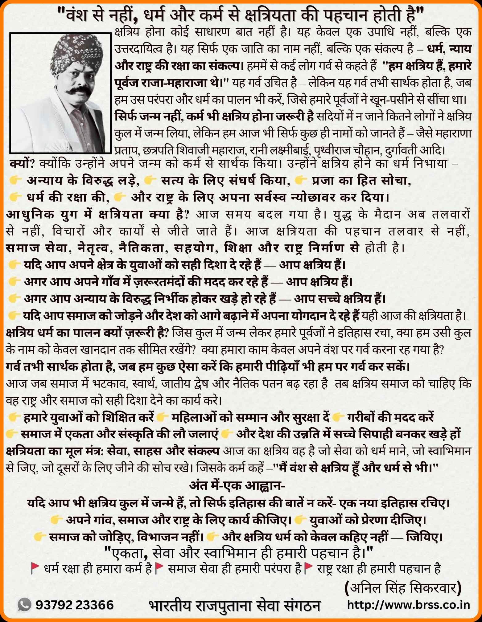 संस्थापक अध्यक्ष का संकल्प:- प्रत्येक राजपूत को जोड़ना ,सेवा भाव पैदा करना और बेरोजगार युवाओ को रोजगार परक बनाना । अनिल सिंह सिकरवार का संकल्प सत्ता में भागीदारी नही , राजनीति नही बल्कि सामाजिक समृद्धि है ।