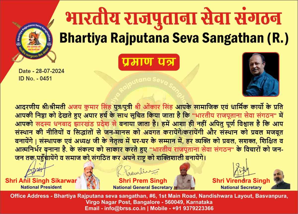 Bhartiya Rajputana seva sangathan, #6, 1st Main Road, Nandishwara Layout, Basvanpura, Virgo Nagar Post, Bangalore - 560049, Karnataka